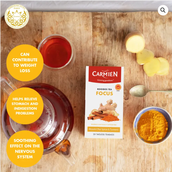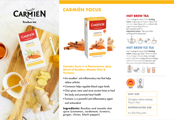 Carmién Focus is a delicate blend of Rooibos, Masala Chai and turmeric. Chai spices include cinnamon, ginger, cardamom, cloves and black pepper. Excellent anti-inflammatory. Used to treat Arthritis. A natural blood thinner that helps regulate blood sugar levels. Chai spices have been used since ancient times to heal the body and promote heart health. Turmeric is also a powerful anti-inflammatory agent and antioxidant.